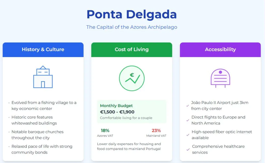 Despite its remote location, Ponta Delgada is highly accessible. João Paulo II Airport is just 3 kilometers from the city, with direct flights to Europe and North America. The city also has high-speed fiber optic internet for remote work and provides comprehensive public and private healthcare services.