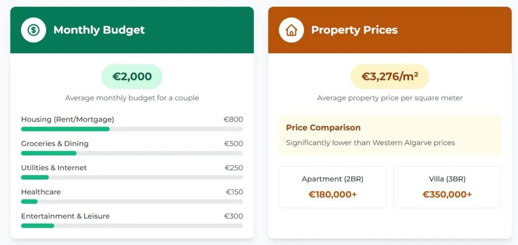 The town is home to a diverse and well-established expat community of British, French, and German residents, which creates a welcoming atmosphere where English is widely spoken. Tavira offers excellent value, with a comfortable monthly budget for a couple around €2,000. Property prices average €3,276 per square meter, significantly lower than in the western Algarve.
