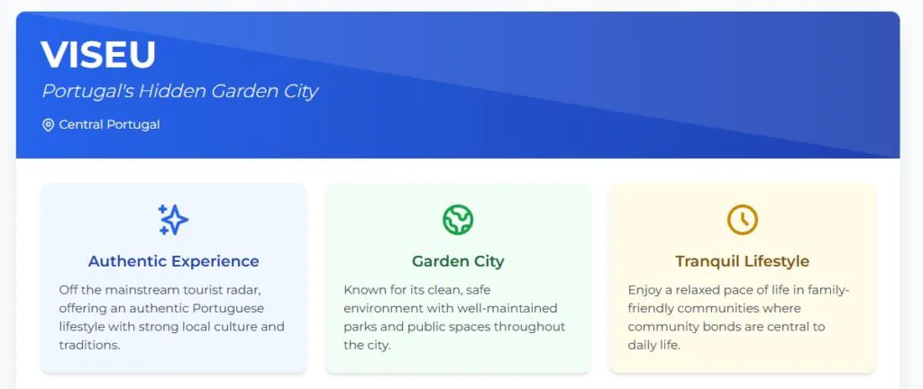 Viseu, known as the ‘Garden City,’ is a clean, safe, and well-organized city in the heart of Portugal that remains off the mainstream tourist radar. This allows it to offer an authentic Portuguese lifestyle, where family-friendly communities thrive and local culture is strong. The city’s well-maintained parks and public spaces reflect its reputation as one of Portugal’s most desirable places to live.