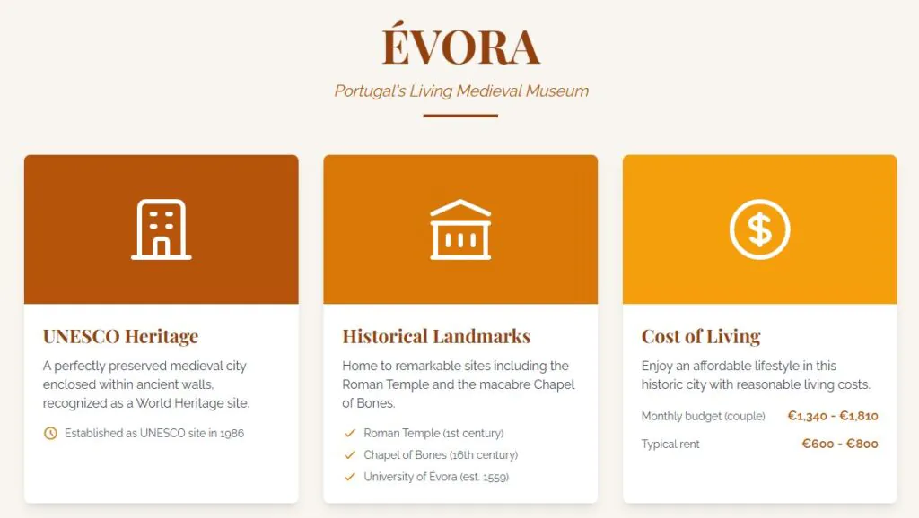 The Alentejo region is known for a slower pace of life that flows through the area’s cork forests and vineyards. This lifestyle, combined with the intellectual energy from the 16th-century University of Évora, creates a unique atmosphere. A couple can live comfortably on €1,340 to €1,810 monthly, with rents typically between €600 and €800.