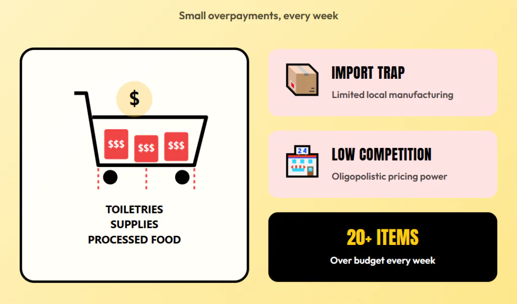 Import dependence, limited domestic competition, and taxes keep everyday household items expensive. Utilities hit even harder, with residential electricity running around $0.266 per kWh.