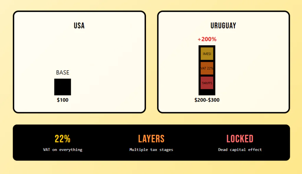 Even budget models show the same pattern, with a Suzuki Swift that costs around $14,000 in the US selling for $23,000 to $26,000 in Uruguay. This is where “dead capital” becomes your real issue, as you spend money on an asset but the taxes don’t bring extra value.