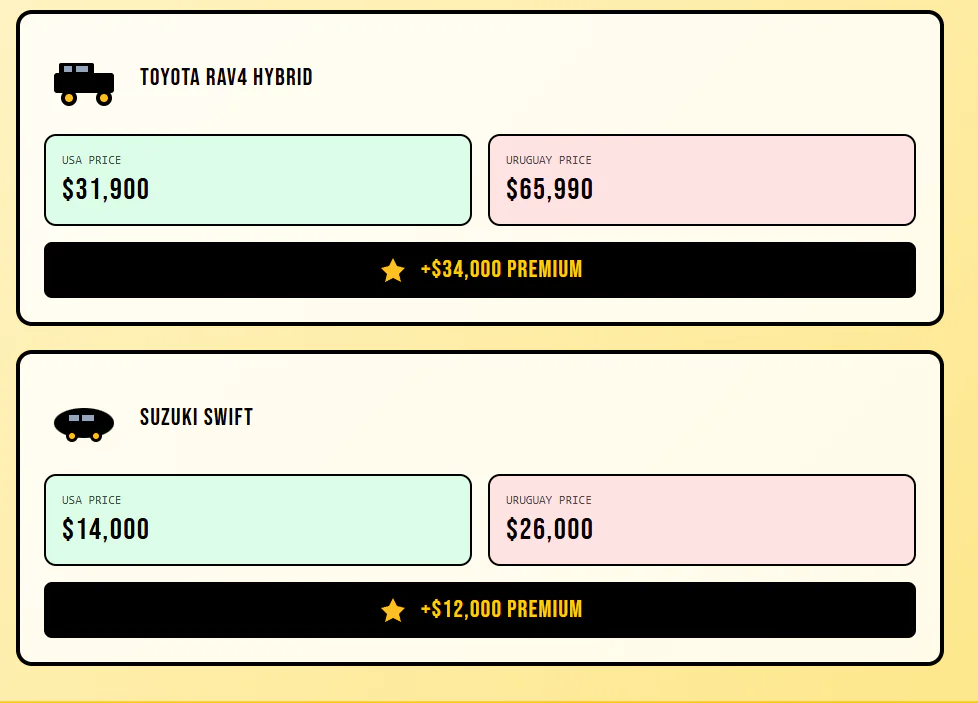 Cars show the problem in the cleanest way, as common models can land at 200% to 300% of US or European pricing. One example: a Toyota RAV4 Hybrid that sells for about $31,900 in the US can cost up to $66,000 in Uruguay.