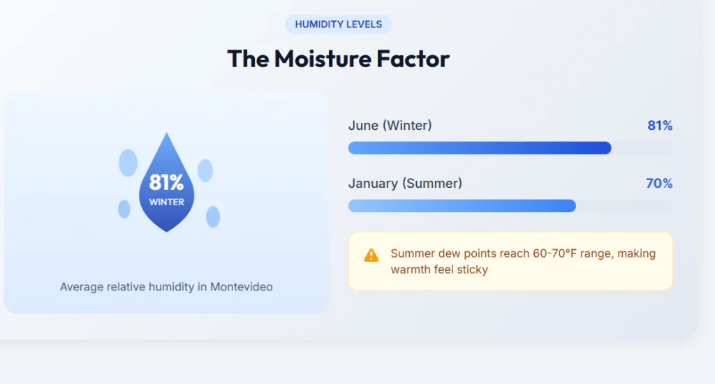 Somehow, some people believe Uruguay has a Mediterranean flair with mild seasons and coastal life where you walk outside most days and it just works. But Uruguay runs on humidity and wind, with average relative humidity in Montevideo running about 81% in June and 70% in January.