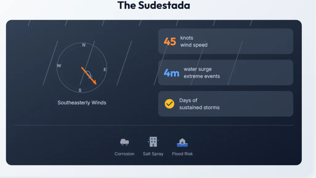 And then there’s the Sudestada, which are southeasterly winds that can push up to 45 knots (50 miles per hour) and last for days. In the extreme case, water surges up to four meters, bringing salt spray, corrosion on cars, and flood risk in some parts.