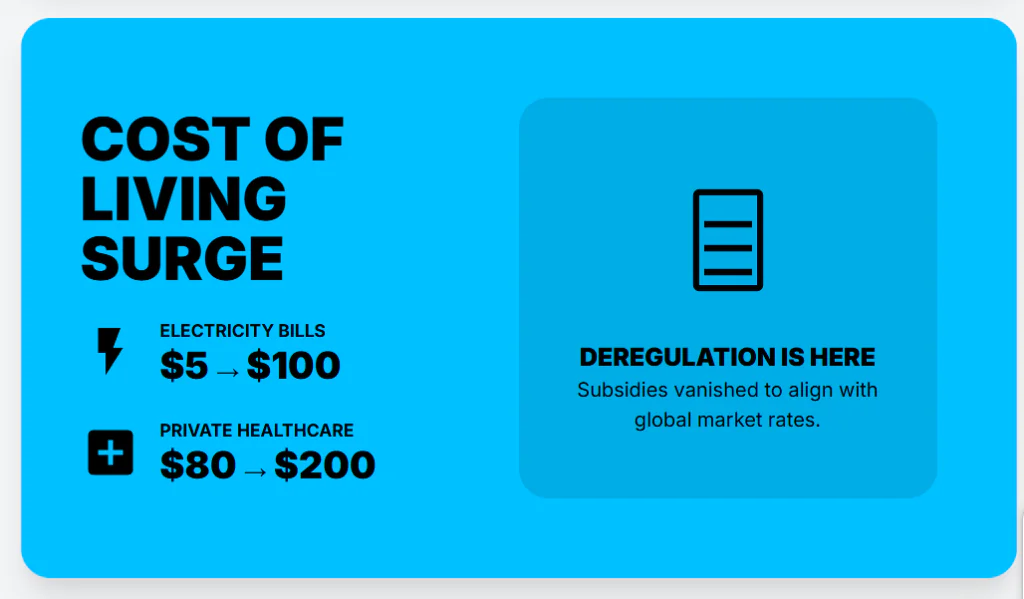 This price increase hits hardest in the categories you cannot avoid. To cut expenses, the new government removed subsidies on energy and other utilities, and companies now charge market rates.