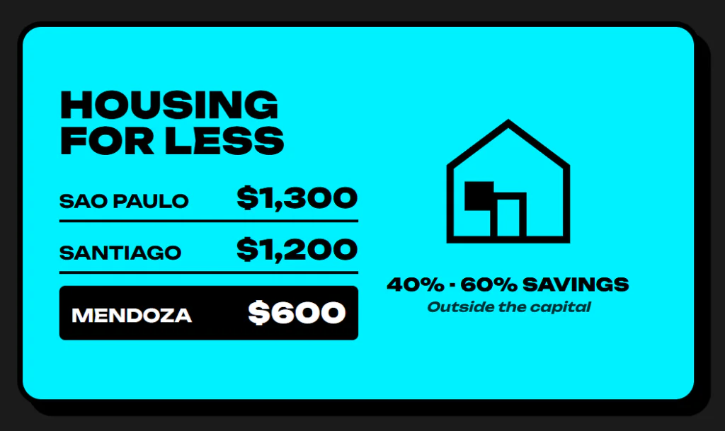In Buenos Aires, it is a similar price. But if you go outside Buenos Aires to Mendoza or Córdoba, rents drop by 40 to 60 percent. In Godoy Cruz, close to Mendoza, you can live in a massive house for US$1,200. These cheaper costs also allow you to “buy time.”