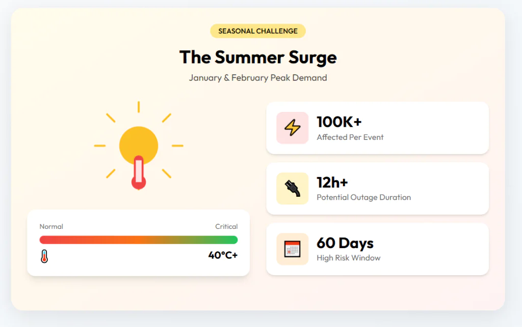 The problems cluster around the summer months. When heatwaves hit in January and February, demand spikes and the infrastructure sometimes fails.
