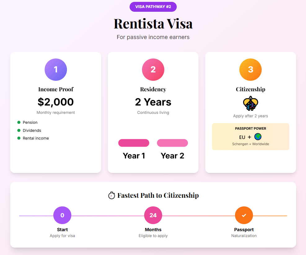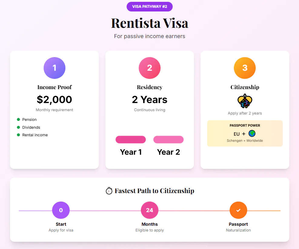 The Rentista visa targets retirees or anyone living on dividends, pensions, or rental income. The financial requirement involves proof of about $2,000 USD per month and offers a clear route to permanent residency.