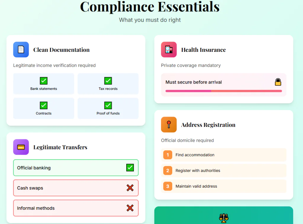 You need clean income documentation and must use legitimate financial transfer methods rather than informal cash swaps. You also need to secure private health insurance and register your address officially.