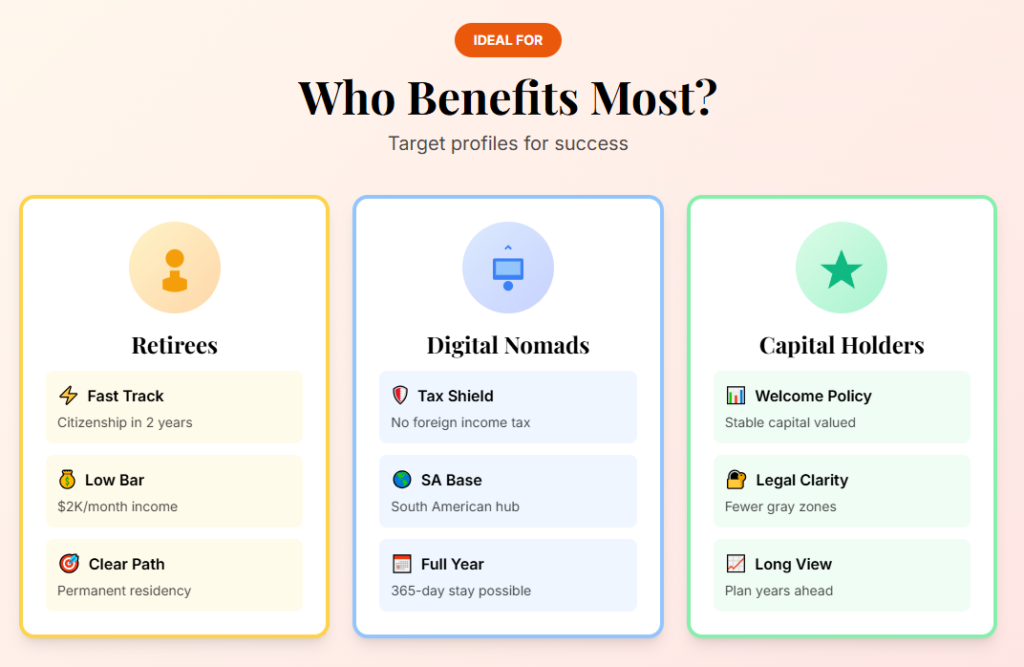 This setup benefits expat retirees, for whom the residency process is relatively fast. The biggest win is the possibility to plan years ahead with fewer legal gray zones.