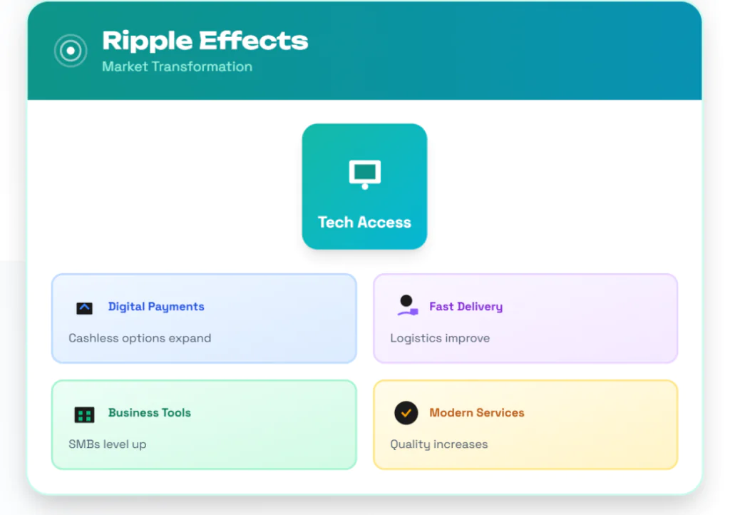 More affordable technological products push more modern services. You see more digital payment options and faster delivery logistics because small businesses can afford better tools.