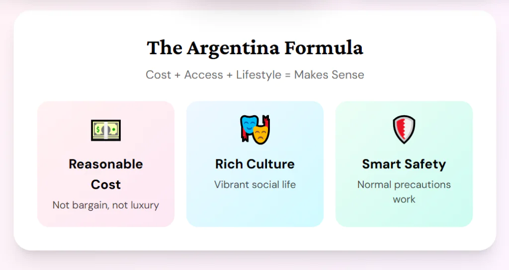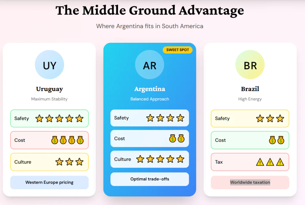Argentina lands in the middle with a good trade-off between cost, safety, and lifestyle. This price surge acts as a filter that pushes out the chaos-chasers.