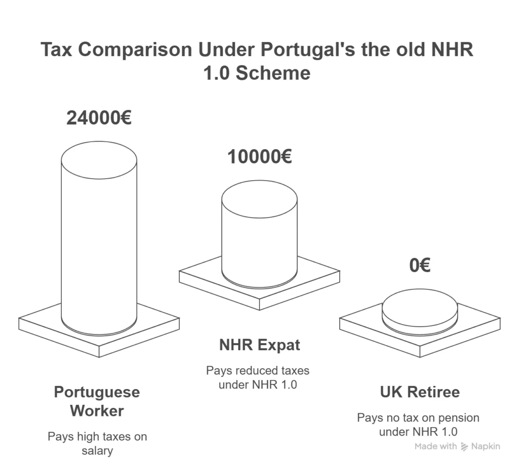 Next door, an NHR expat with the exact same income pays just €10,000. Even more dramatic: a retiree from the UK with a €50,000 pension could pay zero tax under NHR, while their Portuguese neighbor with the same pension would hand over nearly half to the government.