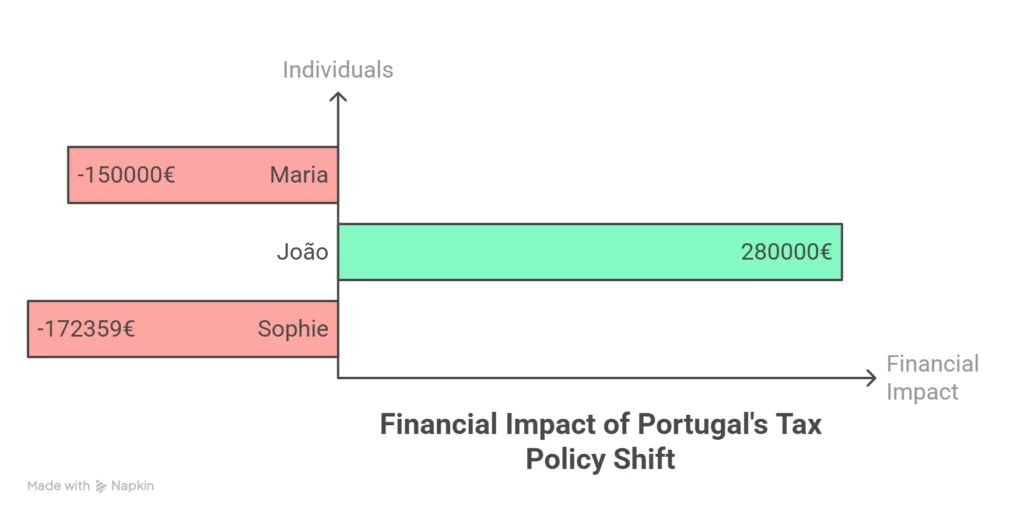 Adding up the decade-long impact shows just how strategic Portugal’s policy shift has been. Mary loses over €150,000 compared to the old system. João gains €280,000 he wouldn’t have had under standard taxation. Sophie potentially loses out on €172,359 in tax savings she would have enjoyed just a year earlier.